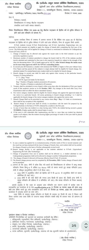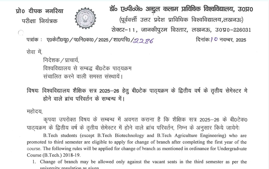 विषयः विश्वविद्यालय शैक्षिक सत्र 2025-26 हेतु बी०टेक पाठ्यक्रम के द्वितीय वर्ष के तृतीय सेमेस्टर मे होने वाले ब्रांच परिवर्तन के सम्बन्ध में।