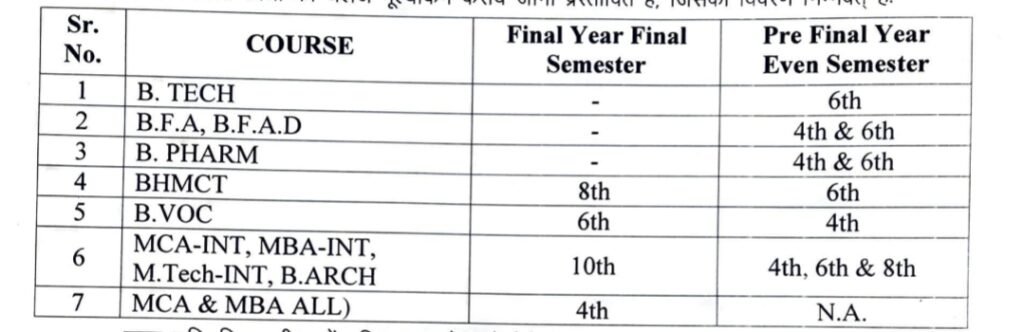 विश्वविद्यालय के सत्र 2024-25 के सम सेमेस्टर के प्रथम चरण अध्ययनरत छात्र/छात्राओं की लिखित परीक्षायें दिनां 17 मई, 2025 से 13 जून, 2025 के मध्य विभिन्न परीक्षा केन्द्रों पर सम्पन्न कराई गई थी, जिसमें निम्नलिखिर पाठ्यक्रमों एवं सेमेस्टर के अध्ययनरत छात्रों का चैलेंज मूल्यांकन कराये जाना प्रस्तावित है, जिसका विवरण निम्नवत् हैः