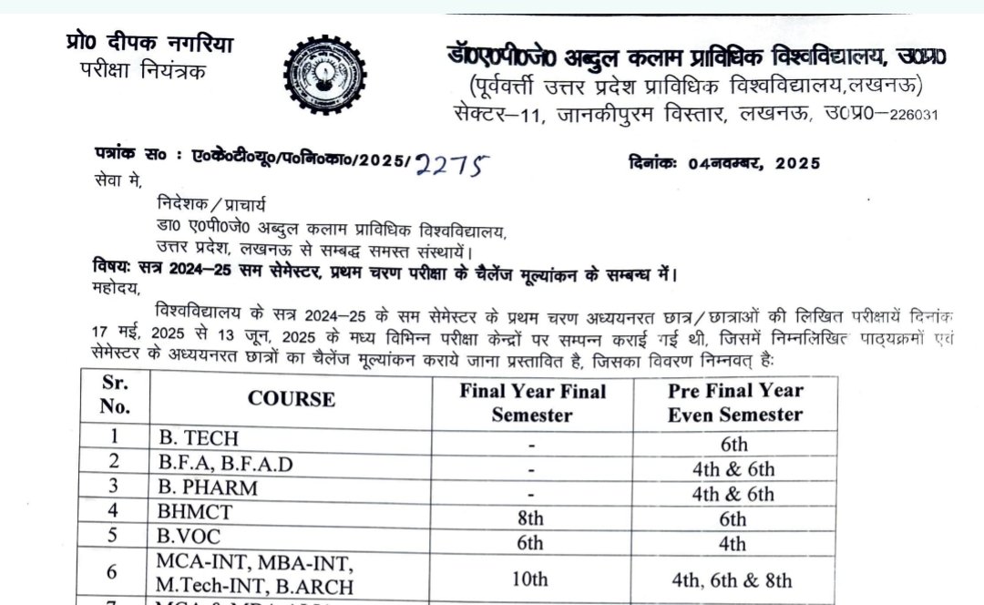 ऑन-लाइन कैलेंज ल्याय कराये जाने से समबन्धित विश्वविद्यालय द्वारा निर्गत पत्र संख्या ए०के०टी०यू०/प०नि० का०/2025/2266 दिनांक 13 अक्टूबर 2006 के अनुसार कार्यवाही के उपरान्त ही छात्र/छात्राएं चैलेंज मूल्यांकन हेतु आवेदन कर सकेंगे।