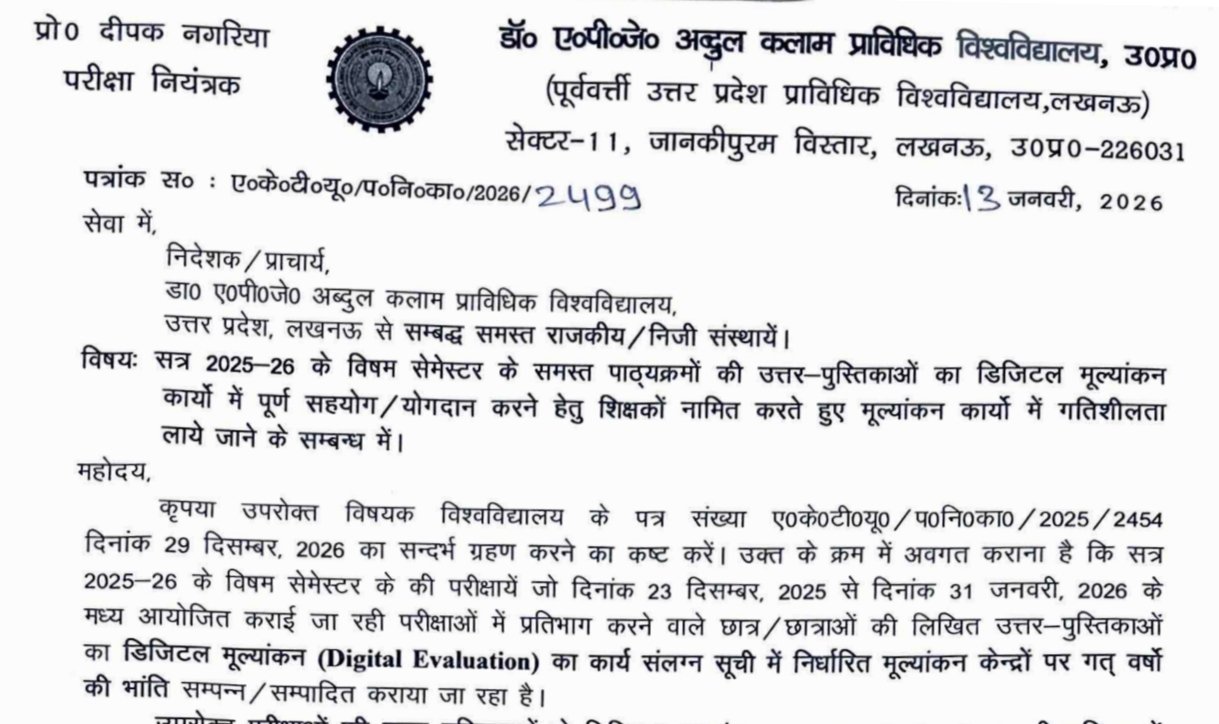विषयः सत्र 2025-26 के विषम सेमेस्टर के समस्त पाठ्यक्रमों की उत्तर-पुस्तिकाओं का डिजिटल मूल्यांकन कार्यों में पूर्ण सहयोग/योगदान करने हेतु शिक्षकों नामित करते हुए मूल्यांकन कार्यों में गतिशीलता लाये जाने के सम्बन्ध में।