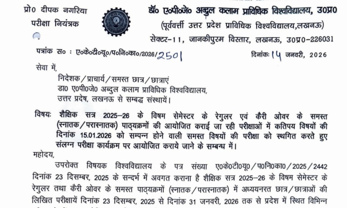उपरोक्त विषयक विश्वविद्यालय के पत्र संख्या ए०के०टी०यू०/प०नि० का०/2025/2442 दिनांक 23 दिसम्बर, 2025 के सन्दर्भ में अवगत कराना है शैक्षिक सत्र 2025-26 के विषम सेमेस्टर के रेगुलर तथा कैरी ओवर के समस्त पाठ्यक्रमों (स्नातक/ परास्नातक) में अध्ययनरत छात्र/छात्राओं की लिखित परीक्षायें दिनांक 23 दिसम्बर, 2025 से दिनांक 31 जनवरी, 2026 तक से प्रदेश में स्थित विभिन्न परीक्षा केन्द्रों पर आयोजित कराई जा रही है।