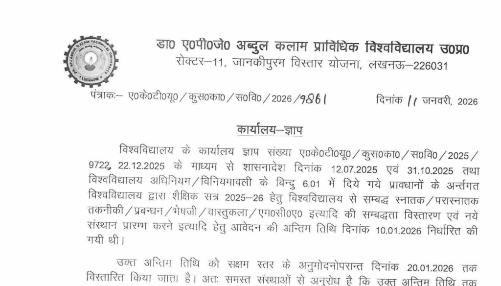 विश्वविद्यालय के कार्यालय ज्ञाप संख्या ए०के०टी०यू०/कुस०का० / स०वि०/2025/9722, 22.12.2025 के माध्यम से शासनादेश दिनांक 12.07.2025 एवं 31.10.2025 तथा विश्वविद्यालय अधिनियम / विनियमावली के बिन्दु 6.01 में दिये गये प्रावधानों के अर्न्तगत विश्वविद्यालय द्वारा शैक्षिक सत्र 2025-26 हेतु विश्वविद्यालय से सम्बद्ध स्नातक / परास्नातक तकनीकी / प्रबन्धन / भेषजी / वास्तुकला/एम०सी०ए० इत्यादि की सम्बद्धता विस्तारण एवं नये संस्थान प्रारम्भ करने इत्यादि हेतु आवेदन की अन्तिम तिथि दिनांक 10.01.2026 निर्धारित की गयी थी।