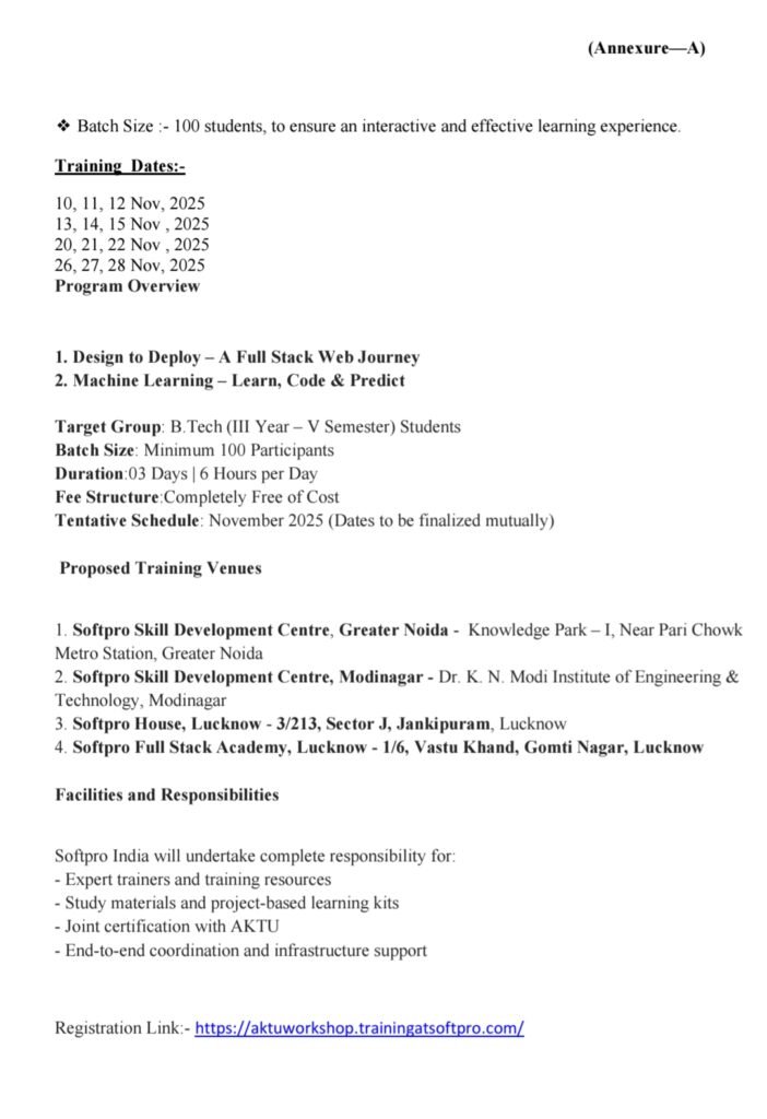 Pleased to inform you that AKTU in collaboration with Softpro India Pvt. Ltd. under the scope of Its MoU exchanged in November, 2023 is organizing a 3 days free workshop on “Web Technologies & Machine Learning” for B.Tech 3rd and 4th year students.