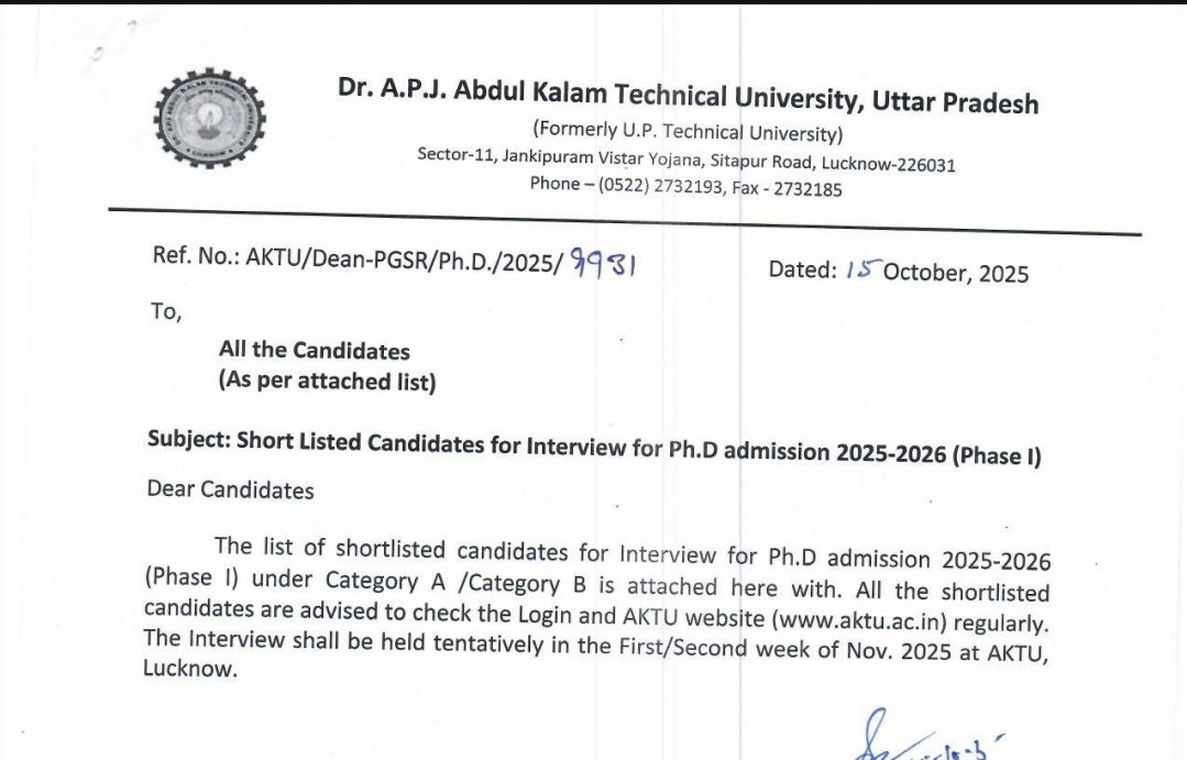 The Interview shall be held tentatively in the First/Second week of Nov. 2025 at AKTU, Lucknow.