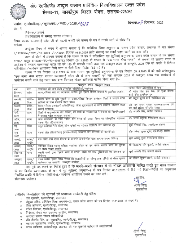The AKTU circular, issued by Registrar Reena Singh on 8 December 2025, refers to a letter from the Uttar Pradesh Technical Education Department dated 10 November 2025, which forwards directions from the Home (Police) Department. These directions are linked to the Government of India’s call to mark Patel’s 150th year through structured programmes across the country.