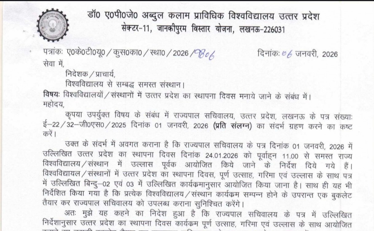 उक्त के संदर्भ में अवगत कराना है कि राज्यपाल सचिवालय के पत्र दिनांक 01 जनवरी, 2026 में उल्लिखित उत्तर प्रदेश का स्थापना दिवस दिनांक 24.01.2026 को पूर्वाह्न 11.00 से समस्त राज्य विश्वविद्यालय / संस्थान में उल्लास पूर्वक आयोजित किये जाने के निर्देश दिये गये हैं।