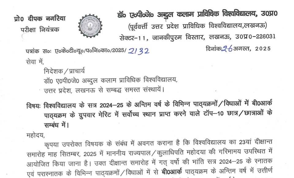 AKTU Topper Students List: Dr. A P J Abdul Kalam Technical University AKTU ने अभी अभी आज 26 August 2025