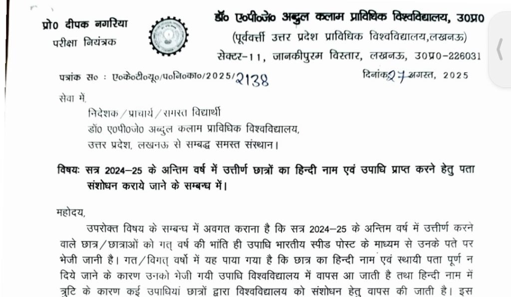 AKTU Correction 2025: Dr. A P J Abdul Kalam Technical University AKTU ने अभी अभी आज 27 August 2025 को