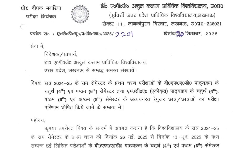 AKTU Official Notice: Dr. A P J Abdul Kalam Technical University AKTU ने अभी अभी आज 19 September 2025 को