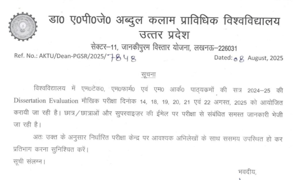 AKTU Dissertation Evaluation Viva Exam: Dr. A P J Abdul Kalam Technical University AKTU ने अभी अभी आज 08 August