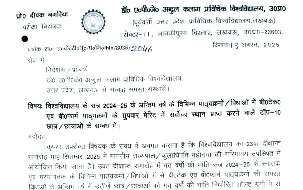 Dr. A P J Abdul Kalam Technical University AKTU ने अभी अभी आज 31 जुलाई 2025 को ऑफिशियल नोटिस जारी